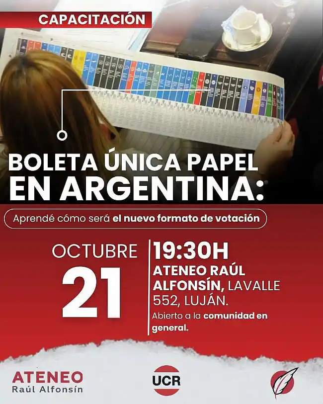 El Ateneo Raúl Alfonsín invita a participar de la actividad abierta de capacitación sobre la implementación de la Boleta Única de Papel en la Argentina, que se realizará el próximo martes 21 de octubre a las 19:30 hs., en su sede de Lavalle 552, Luján.