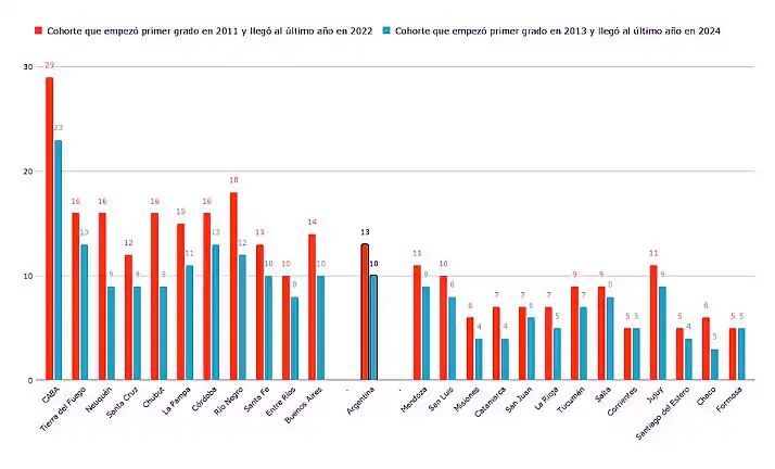 Según el informe elaborado por María Sol Alzú, Martín Nistal y Víctor Volman, para la cohorte que inició la primaria en 2013, el 63% de los estudiantes llegó al último año en 2024 sin interrupciones en su trayectoria. Sin embargo, solo un 10% logró alcanzar niveles satisfactorios o avanzados en ambas materias evaluadas. En comparación, las cohortes anteriores mostraban cifras levemente mejores: en 2011-2022 fue del 13% y en 2009-2020 del 16%.