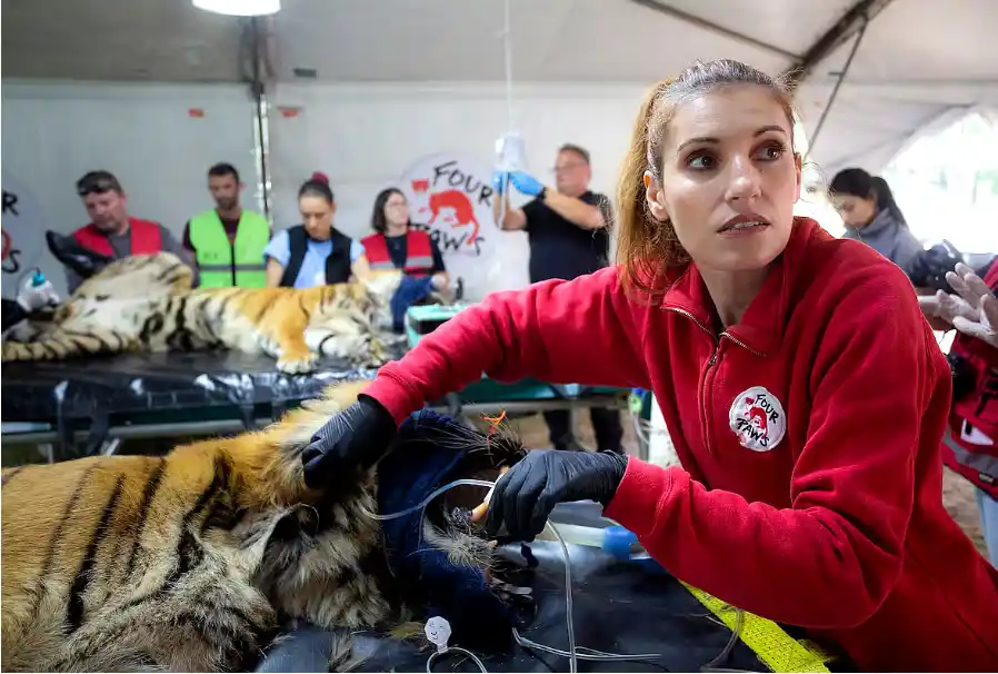 “Es una de las operaciones veterinarias más grandes de la historia. Nuestro trabajo implica el chequeo veterinario de 62 grandes felinos y dos osos”, señaló D’Abramo. Además, remarcó que la organización cuenta con espacio en algunos de sus santuarios y que no abandonará el predio hasta que todos los animales estén en condiciones compatibles con su especie.