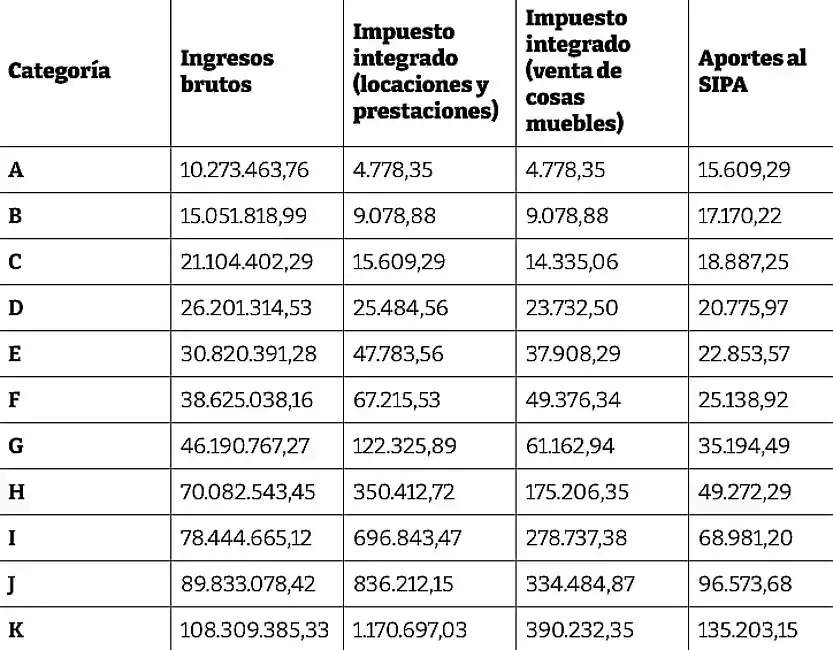 En el extremo superior, la categoría K vería incrementado su límite anual de ingresos de $ 94.805.682,90 a $ 108.309.385,33. En este caso, el impuesto integrado por locación y prestación de servicios subiría de $ 1.024.737,89 a $ 1.170.697,03, mientras que para la venta de cosas muebles pasaría de $ 341.579,30 a $ 390.232,35.